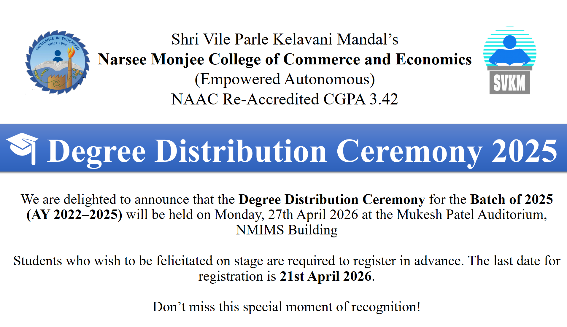 Narsee Monjee College of Commerce & Economics is a leading college affiliated to Mumbai University. It was established in 1964 by Shri Vile Parle Kelavani Mandal (SVKM), a professionally managed trust with a large number of prestigious academic institutions, under its umbrella.